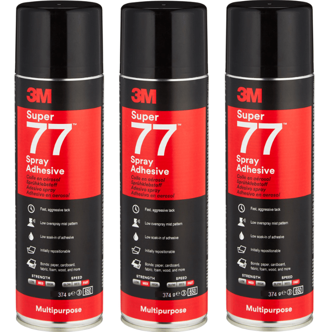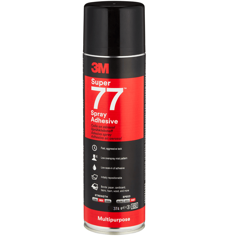 3M Super 77 Multipurpose Spray Adhesive is an extremely versatile, fast-drying, and transparent spray adhesive that bonds a wide range of lightweight materials. Our fast, permanent bond provides fast results to keep projects moving ahead