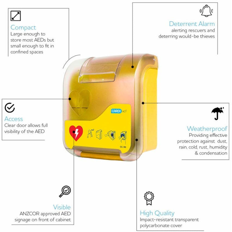 The CardiAct CC-90 Alarmed Outdoor Cabinet provides a compact and secure cabinet for storage of most AEDs. Designed for confined spaces, with its compact size the cabinet also provides clear visibility of the AED with a transparent polycarbonate door that includes AED signage for easy identification in emergencies. Defending against the weather, the CC-90 provides weatherproof protection against dust, rain, cold, rust and humidity with an IP rating of IP54. The CC-90 is suitable for use with the CardiAct Cabinet Stand for versatile mounting options.