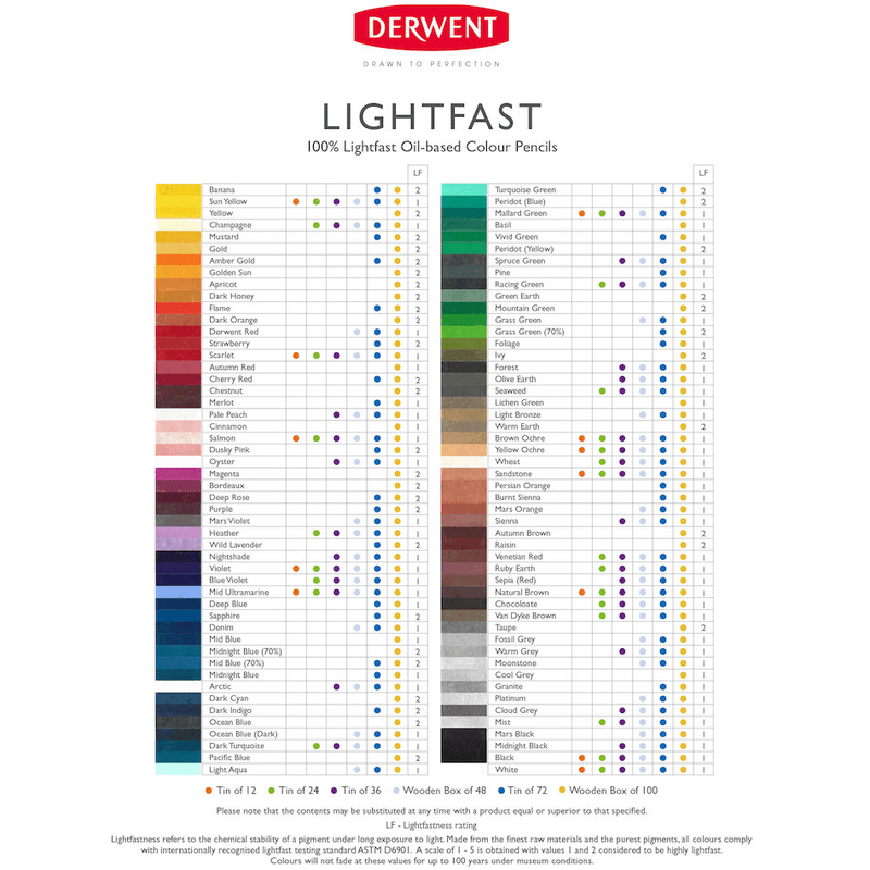 Derwent Lightfast pencils have been formulated to be 100% lightfast. The revolutionary core is resistant to prolonged colour change ensuring artwork will not fade for up to 100 years under museum conditions. Its smooth oil base creates a rich vibrancy and can be mixed on the page to create a paint-like effect. Discover this range of colours which are compatible with alternative mediums and pencils. All colours are professional quality and comply with international lightfast testing standard, ASTM D6901 and Blue Wool Scale ISO 105.