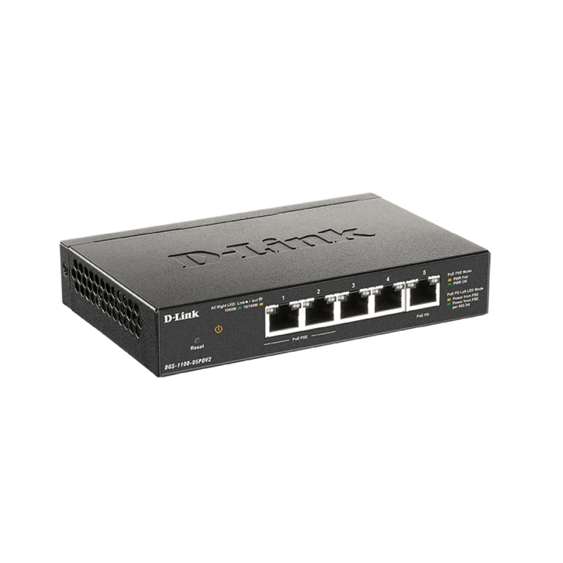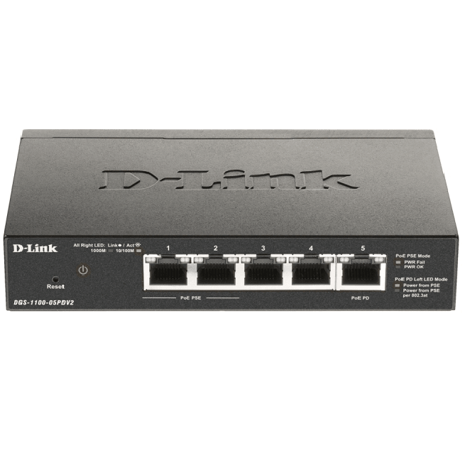 The DGS-1100-05PDV2 is a unique 5-port switch powered through the network cable by an upstream PoE power source (PoE switch or injector). As a “PoE extender”, it also has the ability to propagate (pass-through) PoE power further downstream to one or two Powered Devices (PDs). It comes in a compact desktop-sized metal case with fanless design for silent operation. Advanced management features, diagnostic and troubleshooting tools, and energy efficient technologies provide a flexible solution to suit your networking requirements.