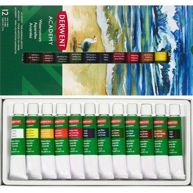 Derwent Academy watercolours are available in a convenient pan set or tubes of paint. Great for creating brilliant washes of even transparent colour.