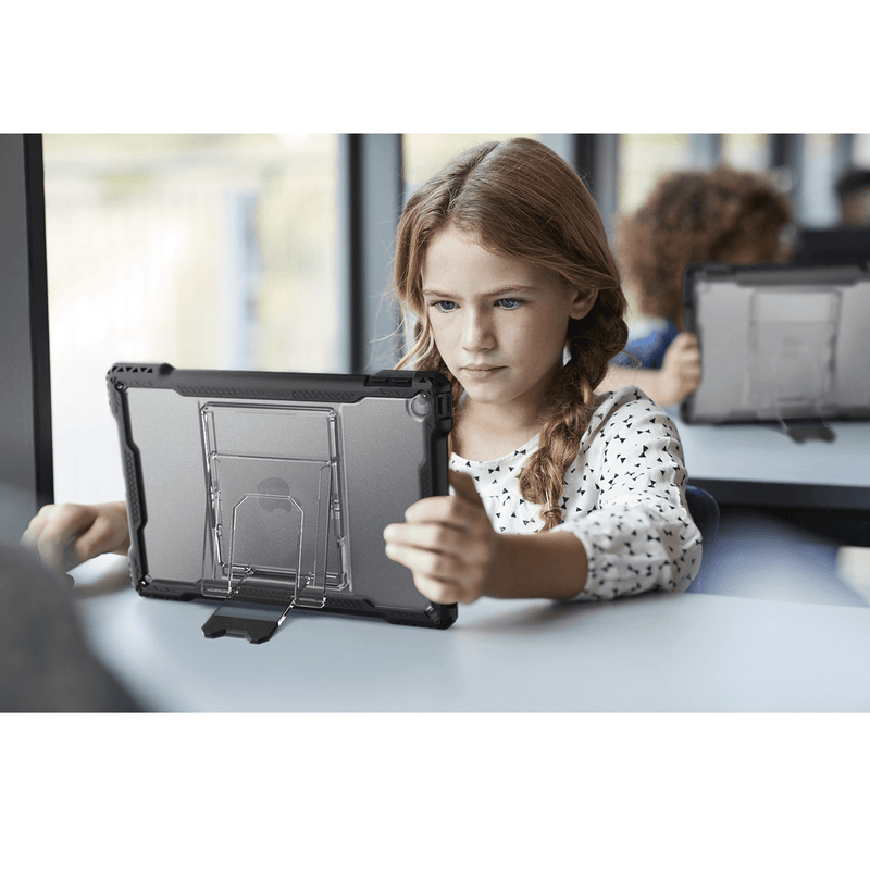 Don’t be fooled by its sleek design. The new Shield Extreme-X for the 10.2-inch iPad delivers rugged, 360-degree protection with an updated two-piece design. Integrated internal air-pockets make for slim yet highly impact- and shock-absorbing corners. Impact-absorbing TPU surrounds edges. The commercial-grade screen cover protects against scratches and impact. An all-new kickstand design is highly durable and adjusts easily to three positions for customized viewing and typing. Designed to support the changing needs of educators and students, it includes durable corner through-holes for attaching our adjustable hand strap, shoulder strap and other lanyard accessories.