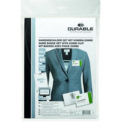 The name badge set includes 20 combi clip badges in size 54 x 90mm and 3 PC-printable A4 insert label sheets