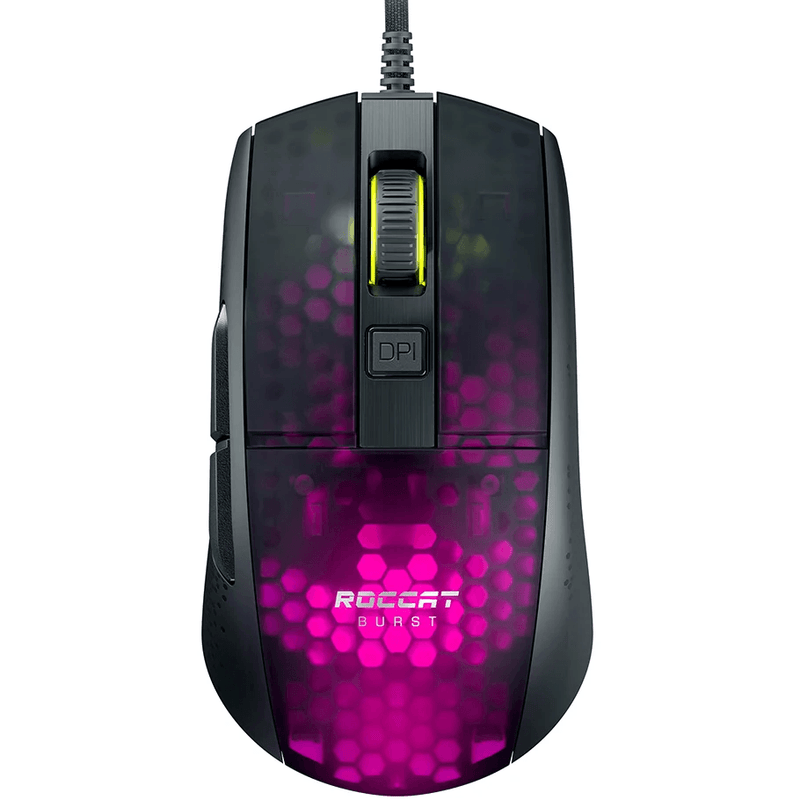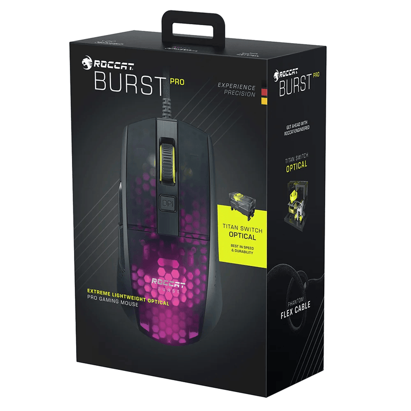 Meet the ROCCAT® Burst Pro Extreme Lightweight Optical Pro Gaming Mouse. Engineered from scratch with a symmetrical ergonomic shape that feels better than any competing mouse from the very first touch. Its striking translucent honeycomb shell keeps weight down to an extreme lightweight 68g and showcases AIMO like never before. The first ROCCAT® mouse to debut the Titan Switch Optical, it also features world-first heat-treated glides and a PhantomFlexTM cable for high-performing, unrestricted gameplay. Light by design.