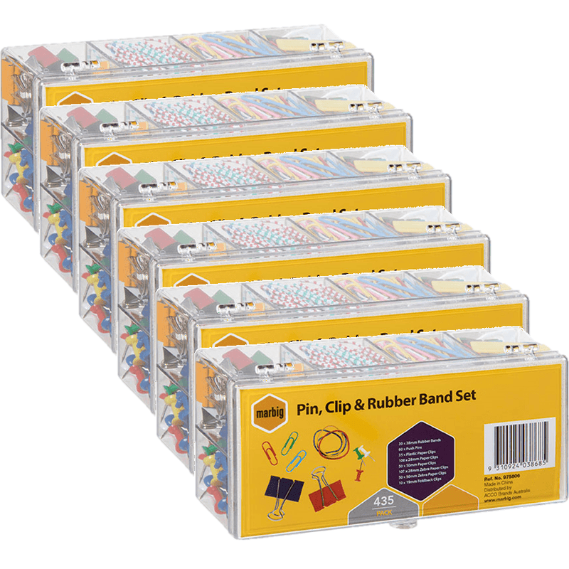 Keep your stationery practical and colourful with the marbig bulk pin clip & band set