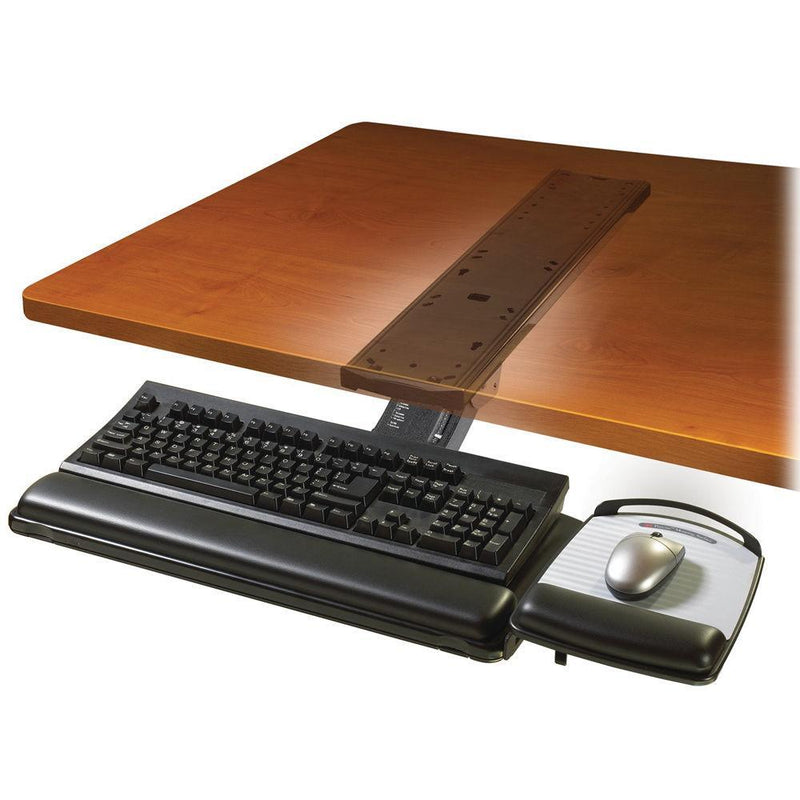 The 3M AKT180LE Adjustable Keyboard Tray with Sit/Stand Easy-Adjust Arm from 3M lets you position your keyboard and mouse in an ergonomically correct position for maximum comfort and productivity. The easy adjustment system and wide range of arm height positions allow you to move between sitting and standing positions, providing ergonomic benefit and helping avoid repetitive stress injuries. The included WR310LE and WR305LE anti-microbial gel wrist rests with Dual Lock Attachment System add comfort and minimize pressure points. The keyboard tray is compatible with corner workstations, where the mounting depth is greater than 23.25 inch. The mouse platform is a separate platform that is separately adjustable