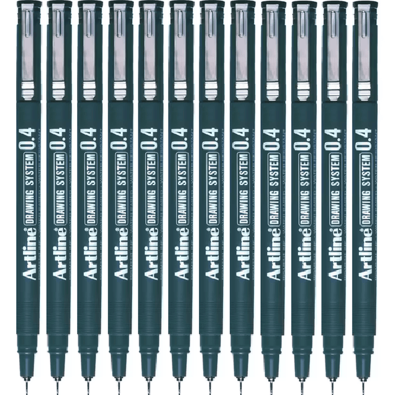 The acid free, water based pigment ink in the Artline technical drawing pen is water resistant and fade proof. The metal furrele is ideal for template and ruling work, making this range ideal for all general writing, drawing and technical drawing
