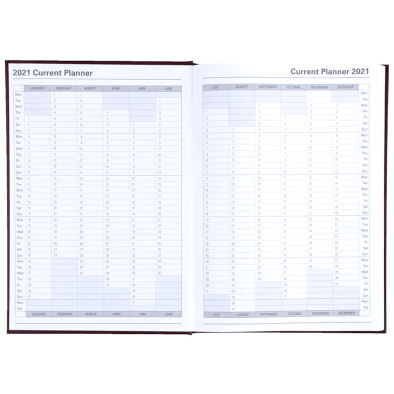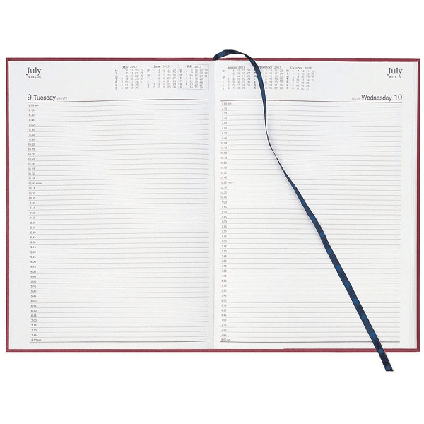 Bound in a new soft look burgundy cover, section sewn for extra strength and with times printed clearly down each page, the page layouts include six-month calendars, week counts, Julian day counts and national and international holidays on the days they occur.