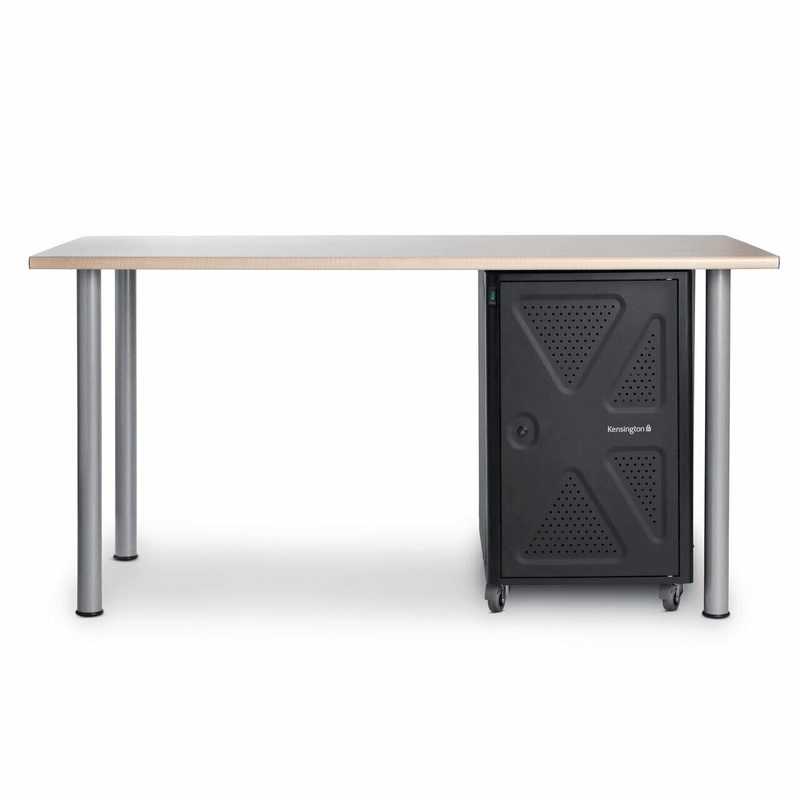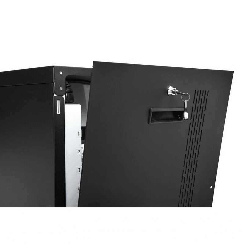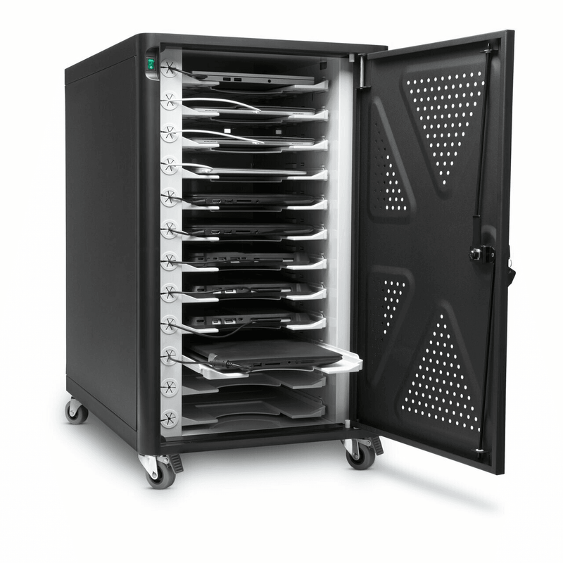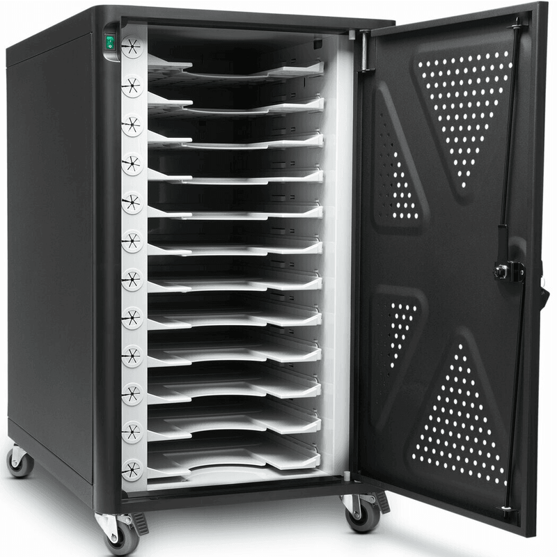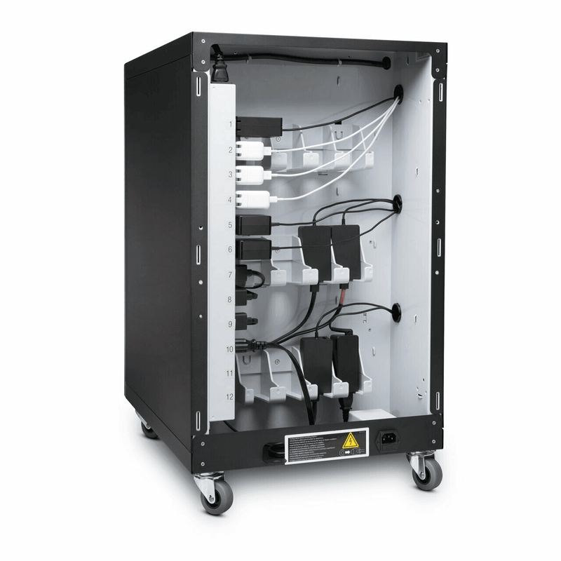 Cabinet holds up to 12 devices where they can be securely stored for charging up to 90 watts each. Rugged dividers with convenient cable routing help manage cord clutter.