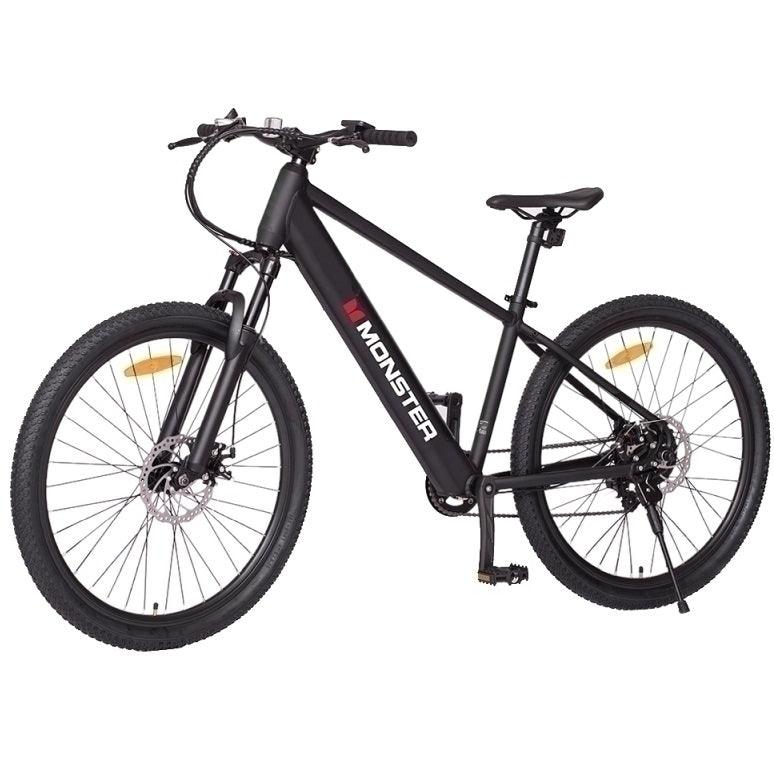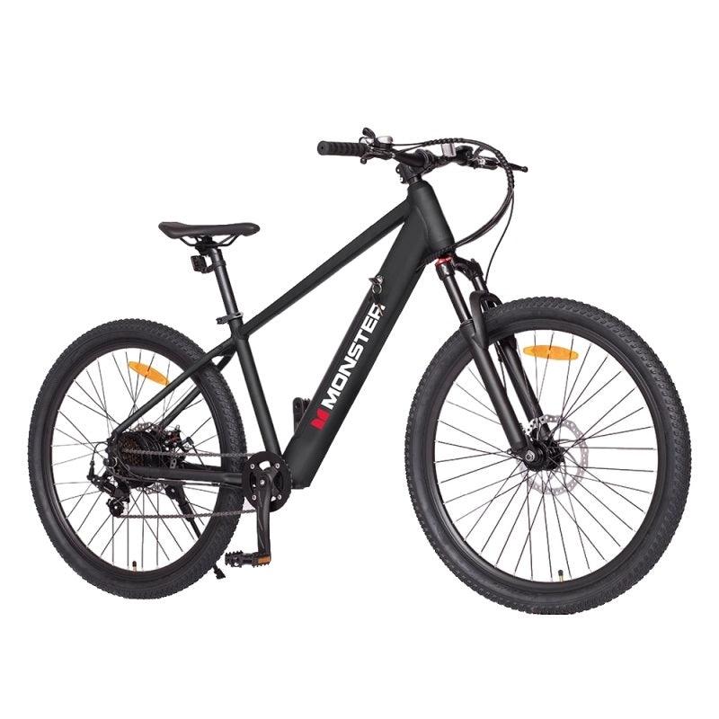 The Monster E-Mountain Bike is the perfect for combination riding, from bitumen to dirt and gravel or grassy fields with its intelligent design. It utilises a 250W motor it makes navigating hills easy. The contemporary frame geometry ensures a stable and forgiving ride, and can corner with precision when your adrenalin kicks in! Standard 27.5” wheel size means lots of tyre choices in the future, and Shimano gears are reliable and easy to use. Conquer your local trails and parks with the Monster Mountain Bike!