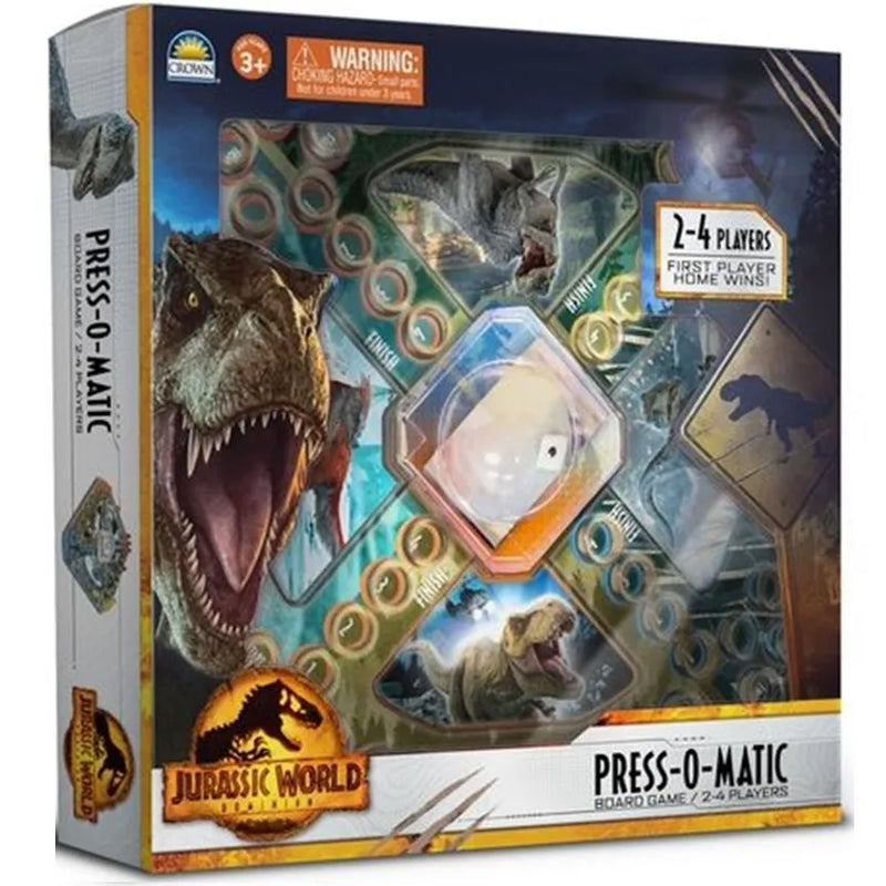 Jurassic World: Dominion Press-O-Matic game is an exciting family game where players try to reach the finish line before their opponents, land on an opponent's piece to send them back to the starting line! Featuring the prehistoric stars of the blockbuster movie: T-Rex, Pyroraptor, Giganotosaurus and Blue, this game is sure to provide many hours of Press-O-Matic fun!