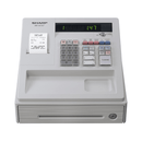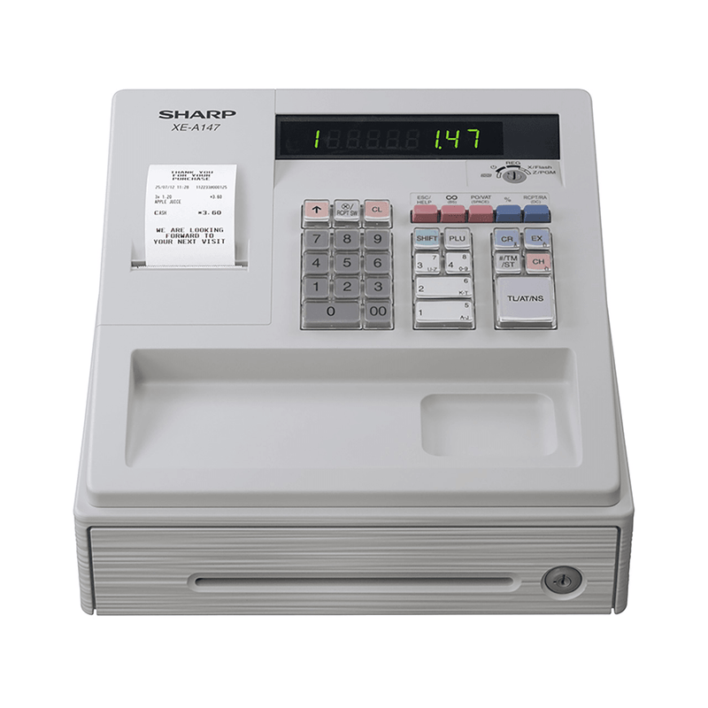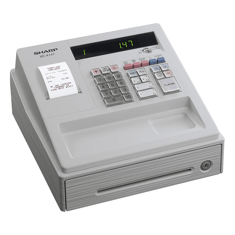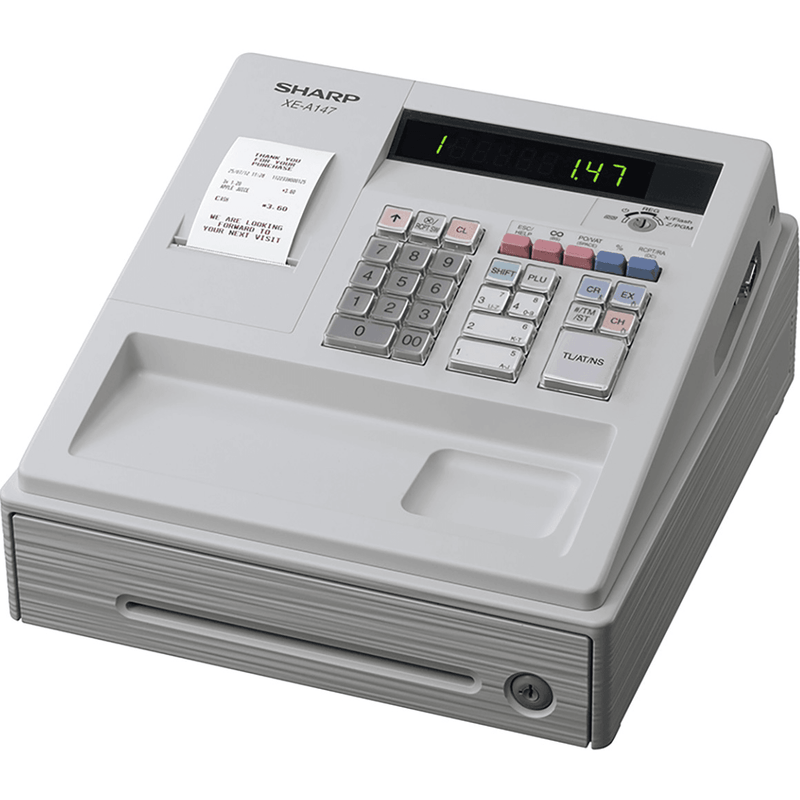 The front locking cash drawer features three banknote compartments and a removable six-compartment coin tray