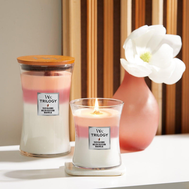 WoodWick® Trilogy Collection offers fragrance combinations, each creating its own, unique experience as the layers melt together. All WoodWick® Trilogy Collection Candles feature the iconic wooden lid.