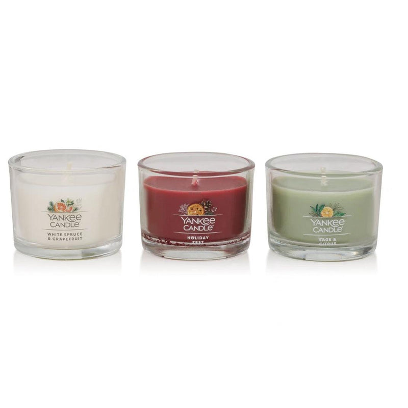 Evoke the joy of a holiday gathering with a curated set of Yankee Candle® Minis featuring White Spruce & Grapefruit, Holiday Zest, and Sage & Citrus.